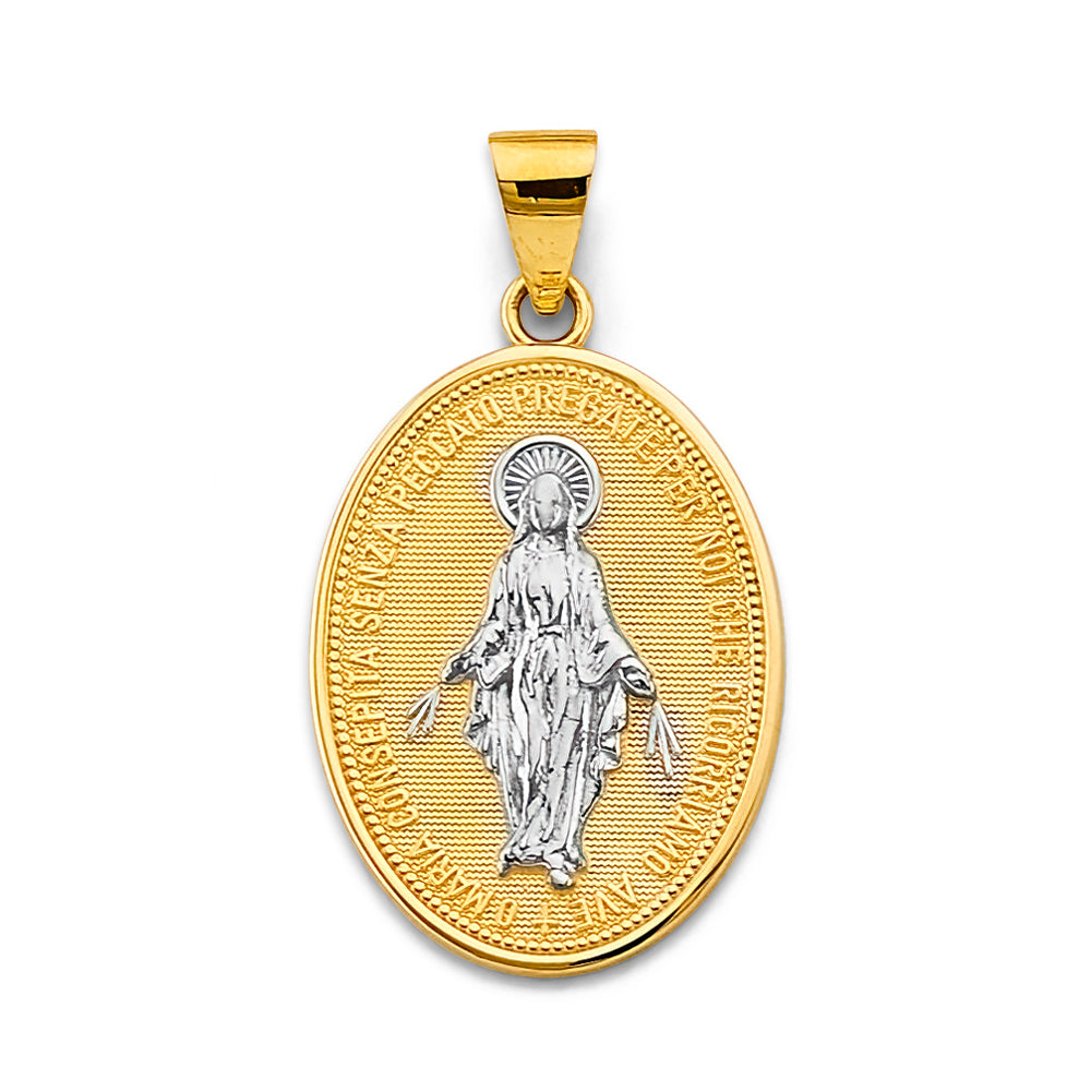 This pendant is crafted in 14K Two-Tone Gold and features the Miraculous Virgin Mary at the center. The background, frame, and bail are polished Yellow Gold, while the figure of Mary is rendered in contrasting White Gold, giving depth and visual distinction to the design. The surrounding oval border includes the traditional Miraculous Medal prayer engraved around the perimeter, adding spiritual meaning to the piece. The fine texture behind the figure enhances light reflection and showcases the detailed craftsmanship. A meaningful devotional medallion suitable for everyday wear or as a gift of faith.