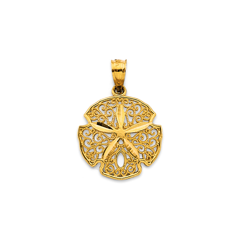 This beautiful 14K Yellow Gold sand dollar pendant features an intricate filigree design inspired by the natural beauty of the ocean. The detailed cut-out pattern highlights the iconic star shape at the center, adding elegance and coastal charm to the piece. Crafted with fine attention to texture and shine, it symbolizes luck, peace, and beachside serenity. Perfect for ocean lovers and those who enjoy timeless seaside-inspired jewelry.