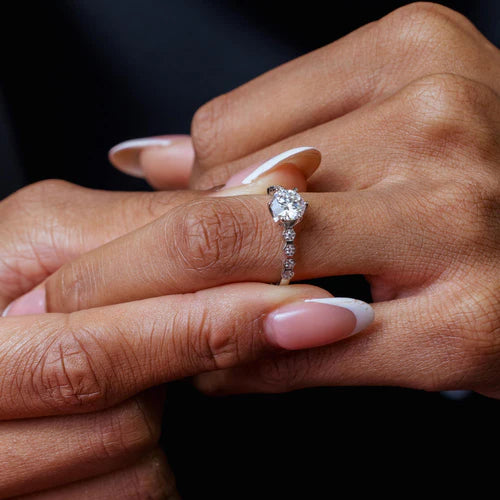 925 Sterling Silver Rhodium Plated 1 Carat Round Moissanite and Clear CZ Ring