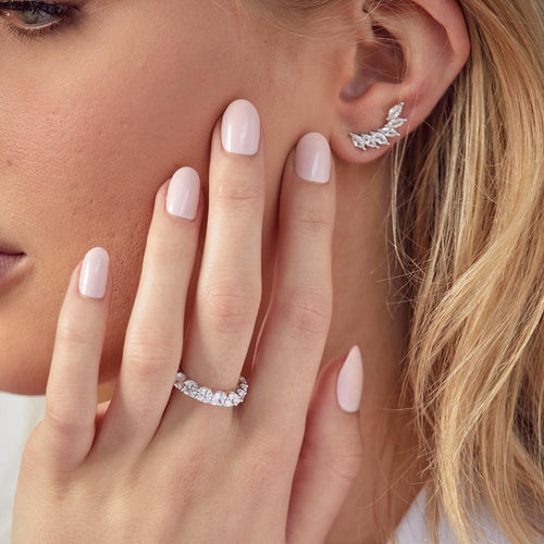 Crafted from 925 sterling silver with a polished rhodium plating, this eternity band ring showcases a continuous row of sparkling cubic zirconia stones. The rhodium finish enhances durability and resistance to tarnish, preserving its brilliant shine over time. Designed for both elegance and lasting wear, this ring offers a sophisticated accessory suitable for daily use or special occasions.