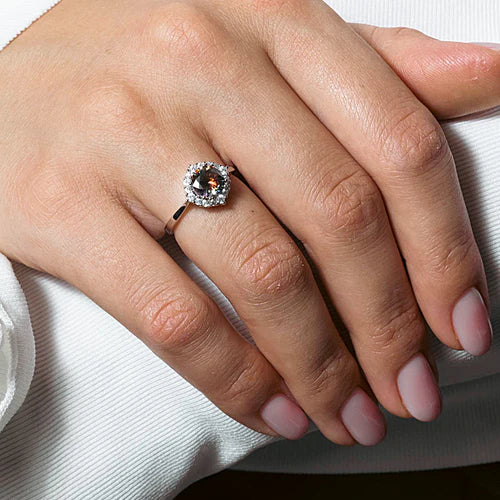 Crafted from 925 sterling silver and finished with a rhodium plating, this ring offers enhanced durability and a brilliant shine. The centerpiece features a round halo design showcasing a mystic topaz surrounded by sparkling cubic zirconia stones, creating a captivating fusion of color and radiance. Perfectly balancing elegance with resilience, this ring is an expert choice for those seeking sophisticated style with long-lasting quality.