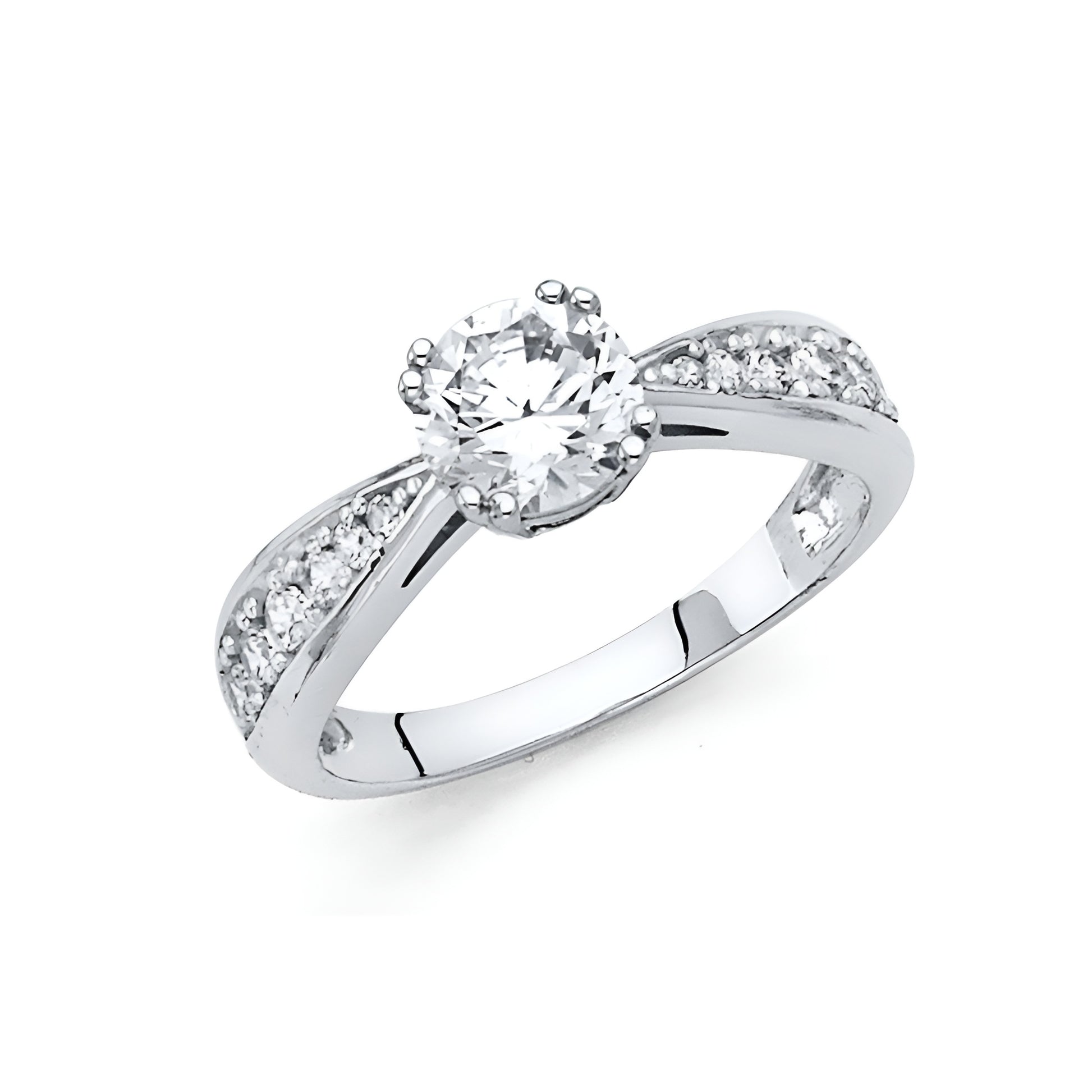 Known to provoke the eye for its pave side stones and centered 1 carat round-cut Cubic Zirconia. This ring contains a pinched band that tapers up top and bottom to make the center and side stones pop!