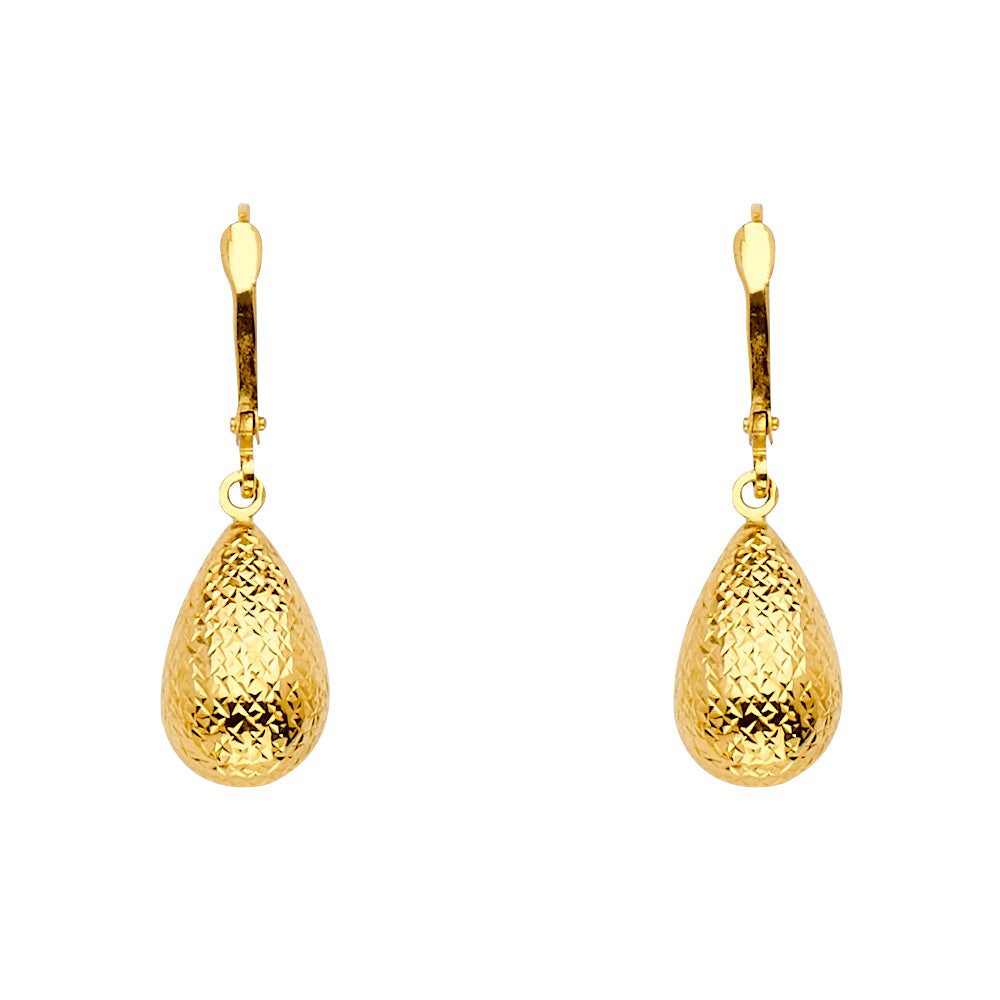 These elegant teardrop drop earrings are crafted in 14K Yellow Gold and feature a fully diamond-cut surface that reflects light with exceptional brilliance. The rounded teardrop silhouette offers a timeless and refined look, while the faceted texture adds depth and sparkle. Designed with secure lever-back closures, these earrings provide comfortable wear and graceful movement. A sophisticated choice for both everyday elegance and special-occasion style.