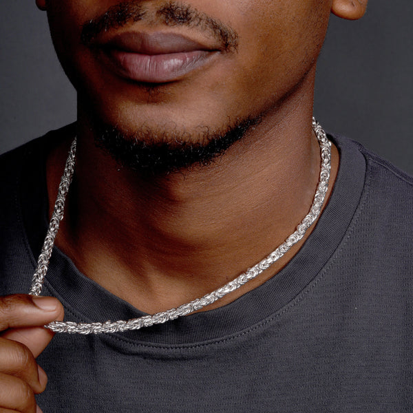 Crafted from premium 925 sterling silver, this Byzantine chain features a 4.9mm width designed for durability and sophisticated style. Its anti-tarnish treatment ensures lasting shine and minimal maintenance, making it an ideal choice for everyday wear or layering. The intricate Byzantine weave provides flexibility and strength, enhancing both comfort and elegance. This chain combines expert craftsmanship with practical resilience, offering a timeless accessory that complements any collection.