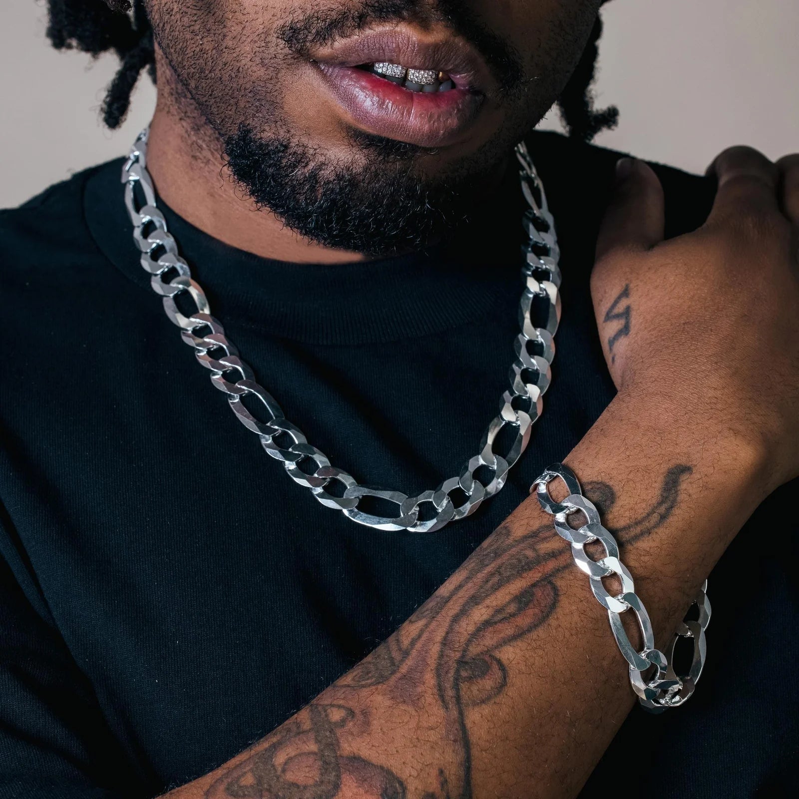 Crafted from high-quality 925 sterling silver, this Figaro 350 chain or bracelet features a 14mm link width that balances boldness with refined elegance. Its classic Figaro pattern combines durability with a timeless design, making it suitable for daily wear or special occasions. The substantial thickness ensures both strength and a striking presence on the wrist or neck, ideal for those seeking a sophisticated, expert-level accessory.