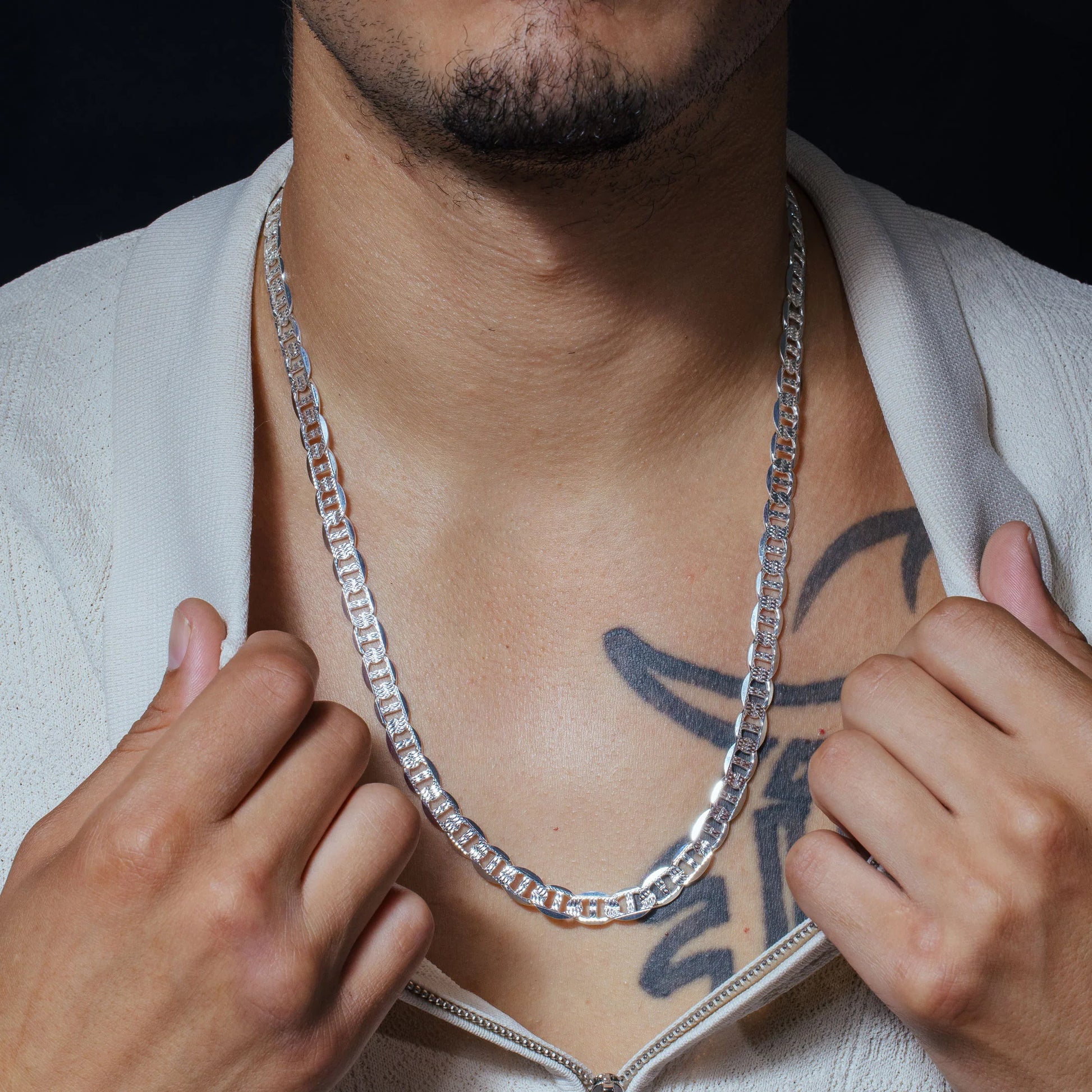 Crafted from premium 925 sterling silver, this Flat Marina chain or bracelet features a 1-sided 180-degree diamond cut design that enhances its brilliance. Measuring 7.5mm in width, it offers a substantial yet elegant profile perfect for both daily wear and special occasions. Its precise cutting technique adds a refined sparkle, ensuring a sophisticated accessory that complements any style with durability and timeless appeal.