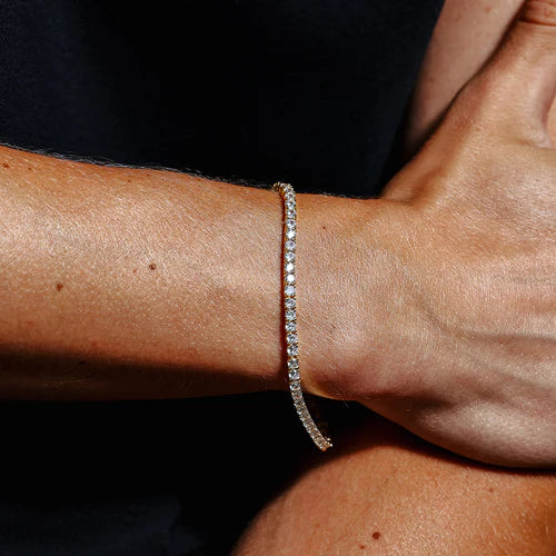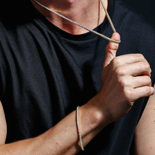Crafted from 925 sterling silver with a refined gold plating, this 3mm CZ tennis necklace and bracelet set offers enduring elegance. The carefully selected cubic zirconia stones provide brilliant sparkle reminiscent of fine diamonds, while the precise craftsmanship ensures lasting comfort and durability. Ideal for elevating both everyday and formal attire, this set combines classic design with expert quality for a sophisticated finish.