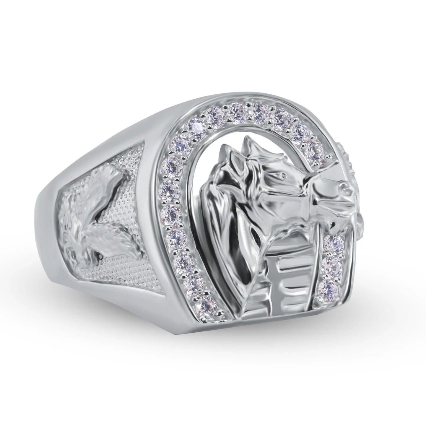 Crafted from 925 sterling silver, this equestrian-inspired ring features a nickel-free, rhodium-plated horseshoe design paired with a detailed horse motif accented by sparkling cubic zirconia stones. The rhodium plating enhances durability and tarnish resistance, ensuring lasting shine and hypoallergenic wear. Ideal for horse enthusiasts seeking a sophisticated accessory that combines elegance with symbolic charm.
