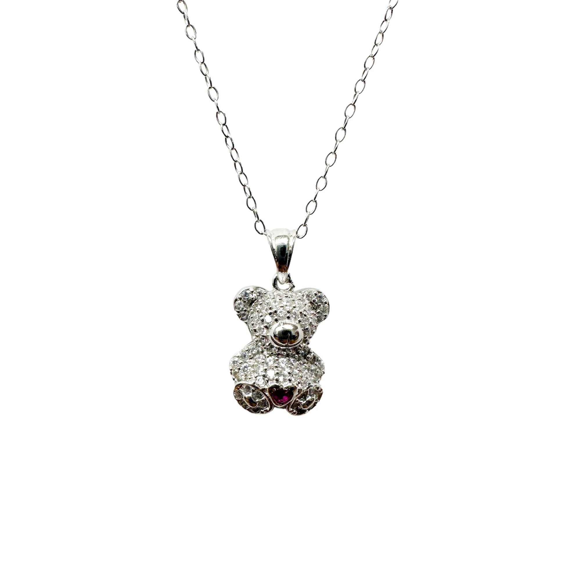 925 Sterling Silver Rhodium Plated Bear Heart Red and Clear CZ Pendant Necklace