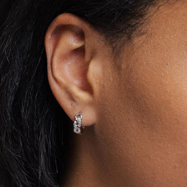 Crafted from 925 sterling silver and enhanced with a rhodium plating, these 14.6mm huggie hoop earrings feature an intricate chain link design accented with sparkling cubic zirconia stones. The rhodium finish provides a durable, tarnish-resistant shine, ensuring lasting brilliance. Designed to sit comfortably close to the earlobe, they offer a refined yet contemporary look suitable for both professional and elegant occasions.