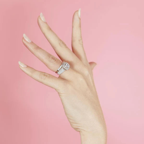 925 Sterling Silver Rhodium Plated Clear Cluster Square CZ Engagement Ring Pair Set