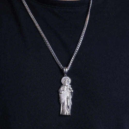 Crafted from high-quality 925 sterling silver and rhodium-plated for enhanced durability and luster, this 61mm St. Jude pendant features sparkling clear cubic zirconia accents. The design offers a refined tribute to the patron saint of lost causes, combining elegance with meaningful symbolism. Its polished finish ensures lasting shine, making it a thoughtful accessory for daily wear or special occasions.