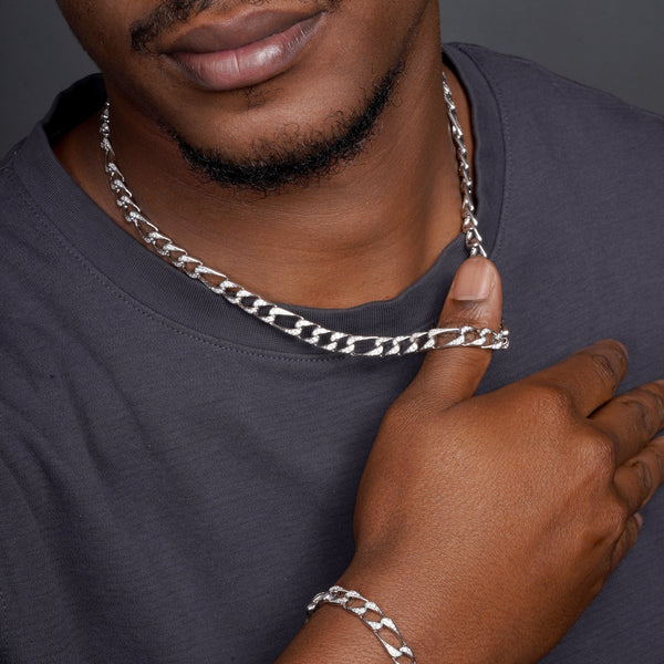 Crafted from premium 925 sterling silver, this 8.2mm Figaro chain is enhanced with a rhodium plating to ensure lasting shine and resist tarnish. The intricate design features sparkling cubic zirconia stones embedded along the links, adding refined brilliance and a touch of sophistication. Ideal for elevating any ensemble, this durable chain balances elegance with everyday wearability.