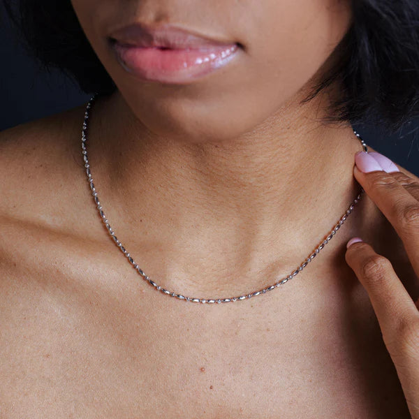 Crafted from 925 sterling silver and enhanced with a rhodium plating, this 2mm chain features a sophisticated diamond-cut design that alternates between round and oval beads. The precision cutting adds subtle brilliance and durability, making it an ideal choice for pairing with various pendants or wearing alone for a refined, timeless look. Its balanced design ensures both strength and elegance, suitable for everyday wear or special occasions.