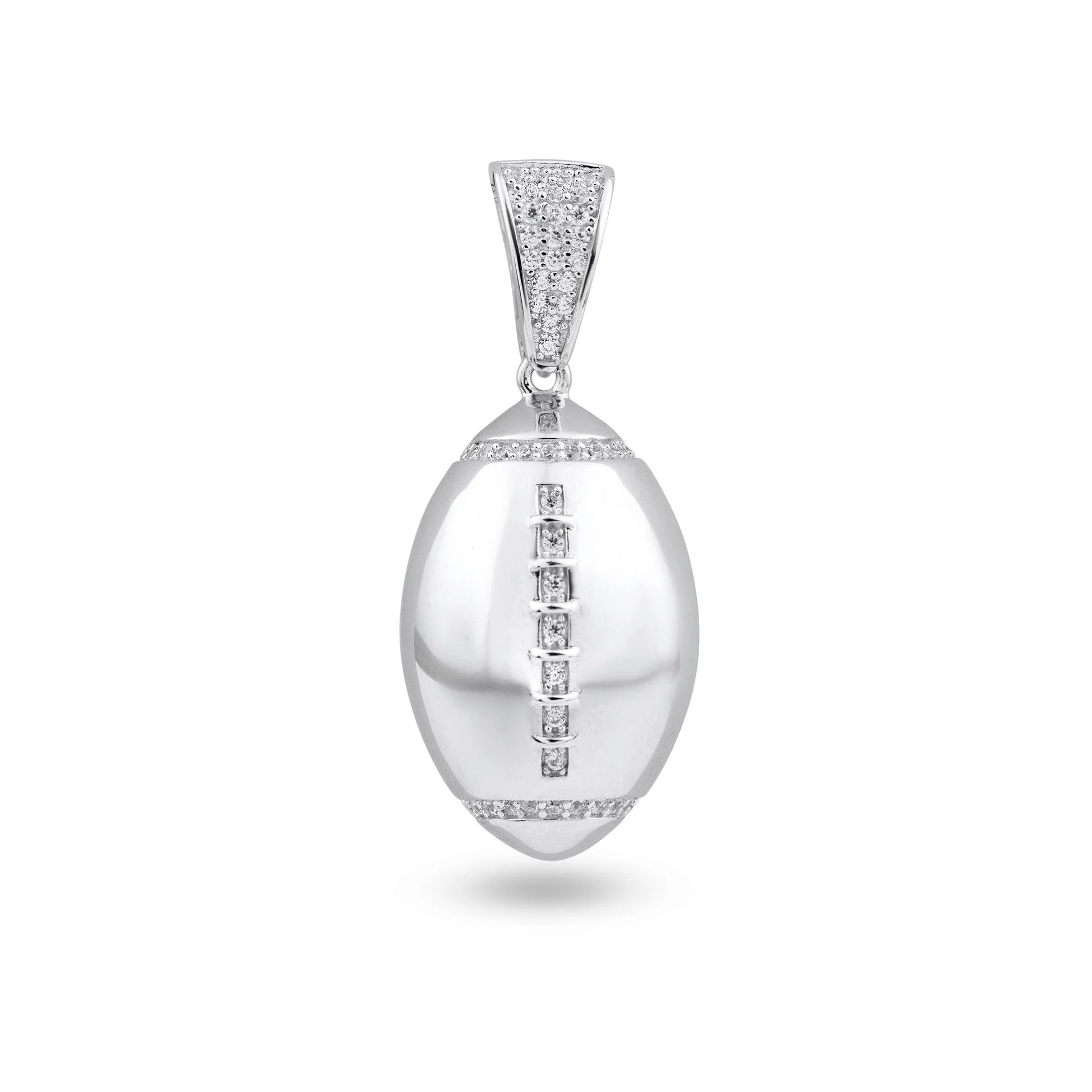 This pendant features a football design crafted from 925 sterling silver with a rhodium plating for enhanced durability and a brilliant shine. Adorned with clear cubic zirconia stones, it offers the elegance of fine jewelry with the affordability and sparkle of CZ. Ideal for sports enthusiasts seeking a sophisticated accessory, this pendant combines quality craftsmanship with a timeless aesthetic.