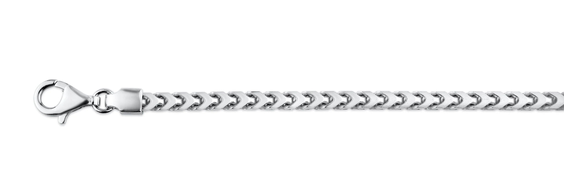 Crafted from premium 925 sterling silver and enhanced with a protective rhodium plating, this Franco 420 chain offers lasting shine and durability. Measuring 4.2mm in width, its tightly woven design ensures both strength and flexibility, making it suitable for everyday wear or layering with other pieces. The rhodium finish enhances tarnish resistance, maintaining the chain’s polished look over time. Ideal for those seeking a refined yet robust accessory that complements any style with expert craftsmanship.