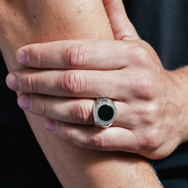 Crafted from 925 sterling silver and enhanced with a rhodium plating, this men's ring combines durability with a sleek, polished finish that resists tarnish. Its distinctive flat round design centers on a deep black onyx stone, known for its timeless elegance and grounding qualities. Accented with sparkling cubic zirconia, this piece offers a refined contrast while maintaining a sophisticated, masculine appeal. Ideal for those seeking a balance of classic style and contemporary detail, this ring provides lasting wear and an understated yet powerful statement.