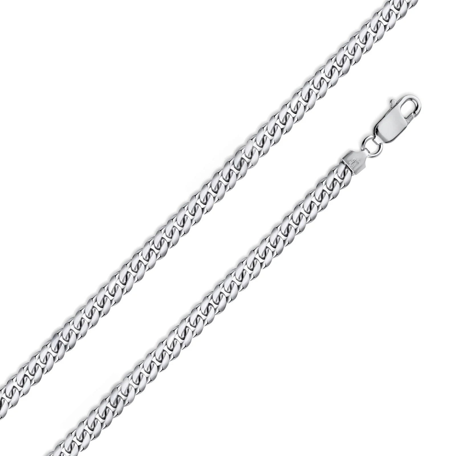 Crafted from high-quality 925 sterling silver and enhanced with a rhodium plating, this Miami Cuban chain offers both durability and a polished, tarnish-resistant finish. Measuring 4.1mm in width, its classic 120 link design provides a balanced blend of strength and refined style, making it an excellent choice for everyday wear or layering with other pieces. This chain’s expert craftsmanship ensures long-lasting shine and comfort.