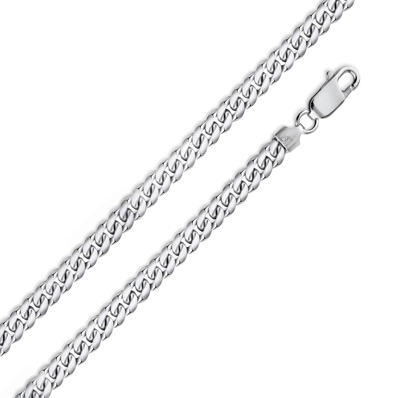 This 925 sterling silver Miami Cuban curb chain or bracelet features a 160-link design with a 5.5mm width, expertly crafted for durability and a polished look. Rhodium plating enhances its shine and protects against tarnish, ensuring long-lasting brilliance. Ideal for adding a refined, classic touch to any outfit, this piece combines strength with sophisticated style in every link.
