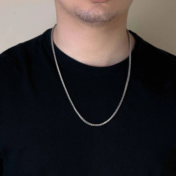 Crafted from 925 sterling silver and enhanced with a rhodium plating, this 3.2mm round Franco chain offers exceptional durability and a brilliant, tarnish-resistant finish. Its tightly woven links provide a smooth, flexible feel that sits comfortably on the skin, making it perfect for everyday wear or layering with pendants. The precise 3.2mm width strikes a balance between subtlety and presence, suited for both casual and formal styles.