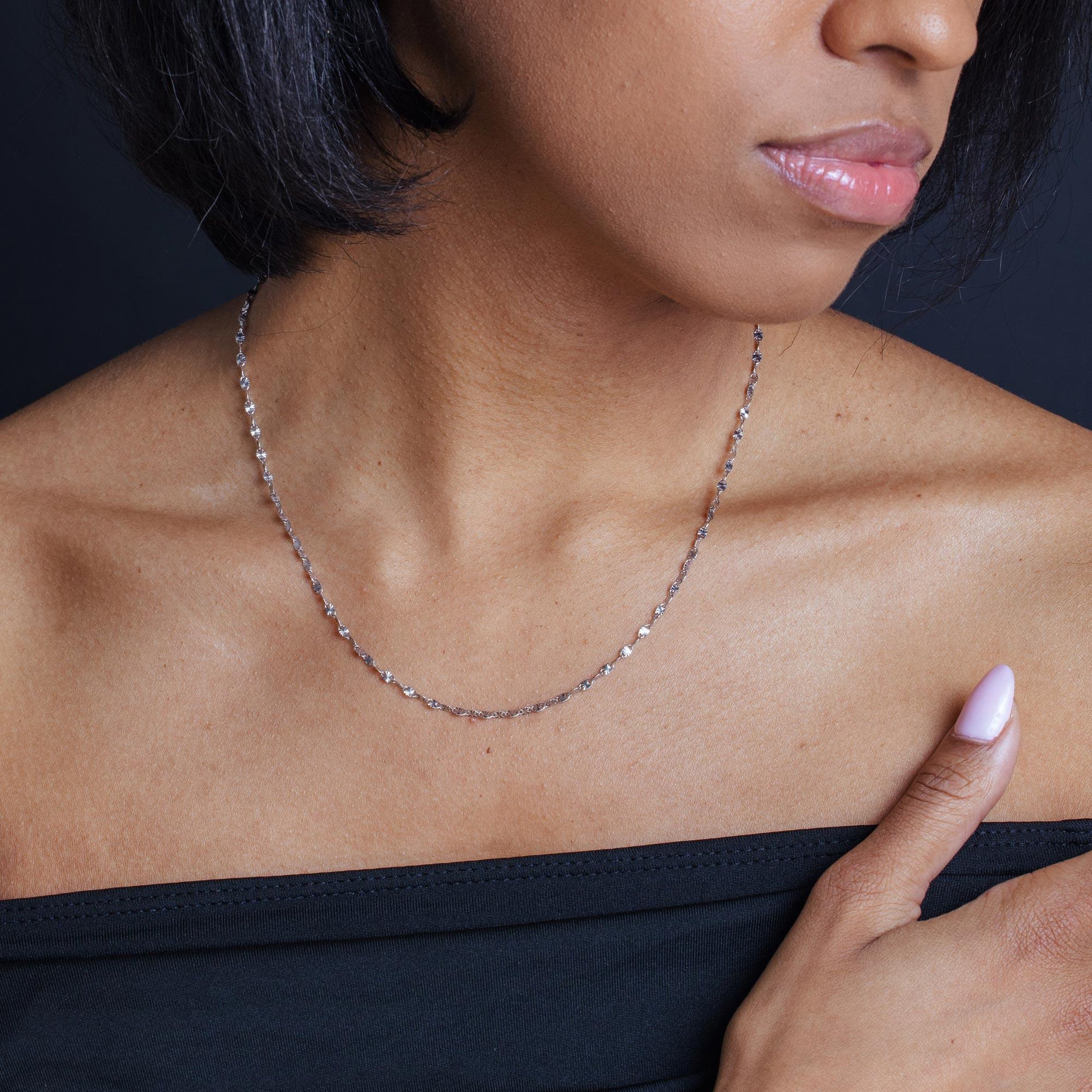Crafted from premium 925 sterling silver and finished with a rhodium plating, this 2.3mm Star Diamond Cut Confetti Chain offers exceptional durability and lustrous shine. Its precisely cut star-shaped facets reflect light brilliantly, adding subtle sparkle and sophisticated texture. Ideal for layering or as a standalone piece, this chain combines timeless elegance with expert craftsmanship for versatile, everyday wear.